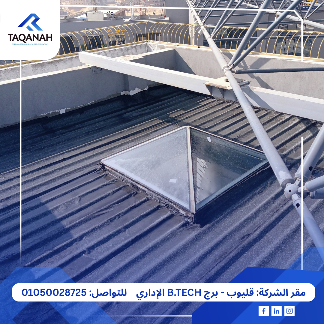 استجابت “تقانة” لهذا التحدي من خلال تصميم وتنفيذ سقف معدني يجمع بين الأداء الوظيفي والجمال المعماري. تم استخدام هيكل معدني خفيف كقاعدة، مغطى بألواح ساندوتش بانل لتحقيق العزل الحراري، تعلوها طبقة من العزل المائي (Membrane) لزيادة الحماية من تسرب المياه وإطالة العمر الافتراضي للمنظومة بالكامل.