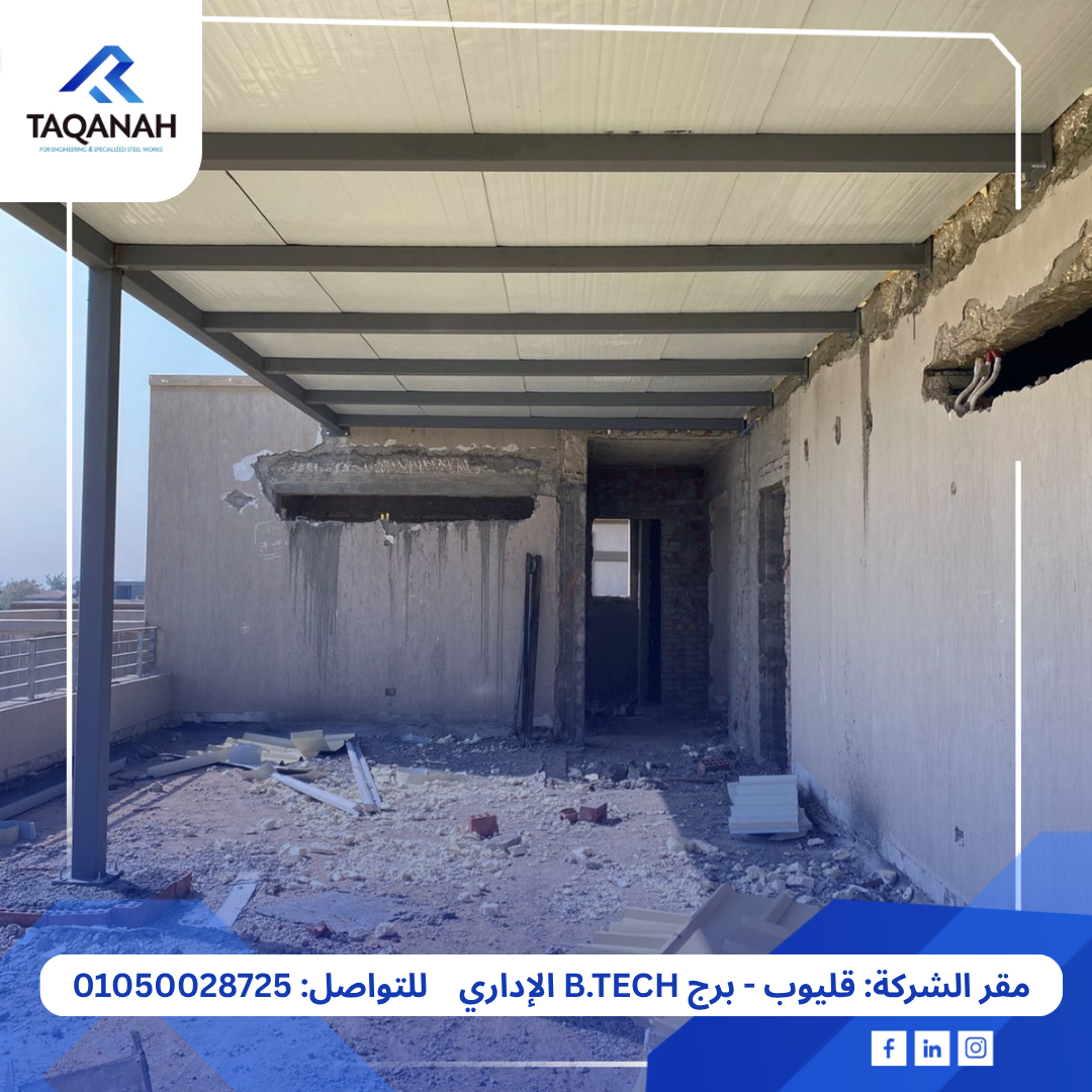 طلب العميل تنفيذ غرفة إضافية على سطح الفيلا باستخدام هيكل معدني خفيف يضمن عدم التأثير على السلامة الإنشائية للمنشأة، مع تحقيق المتانة والجودة اللازمة للاستدامة. تولّت شركة “تقانة” دراسة الحالة الإنشائية للسطح وإعداد التصميم المناسب، وتم التنفيذ باستخدام ألواح ساندوتش بانل لتوفير العزل الحراري اللازم.